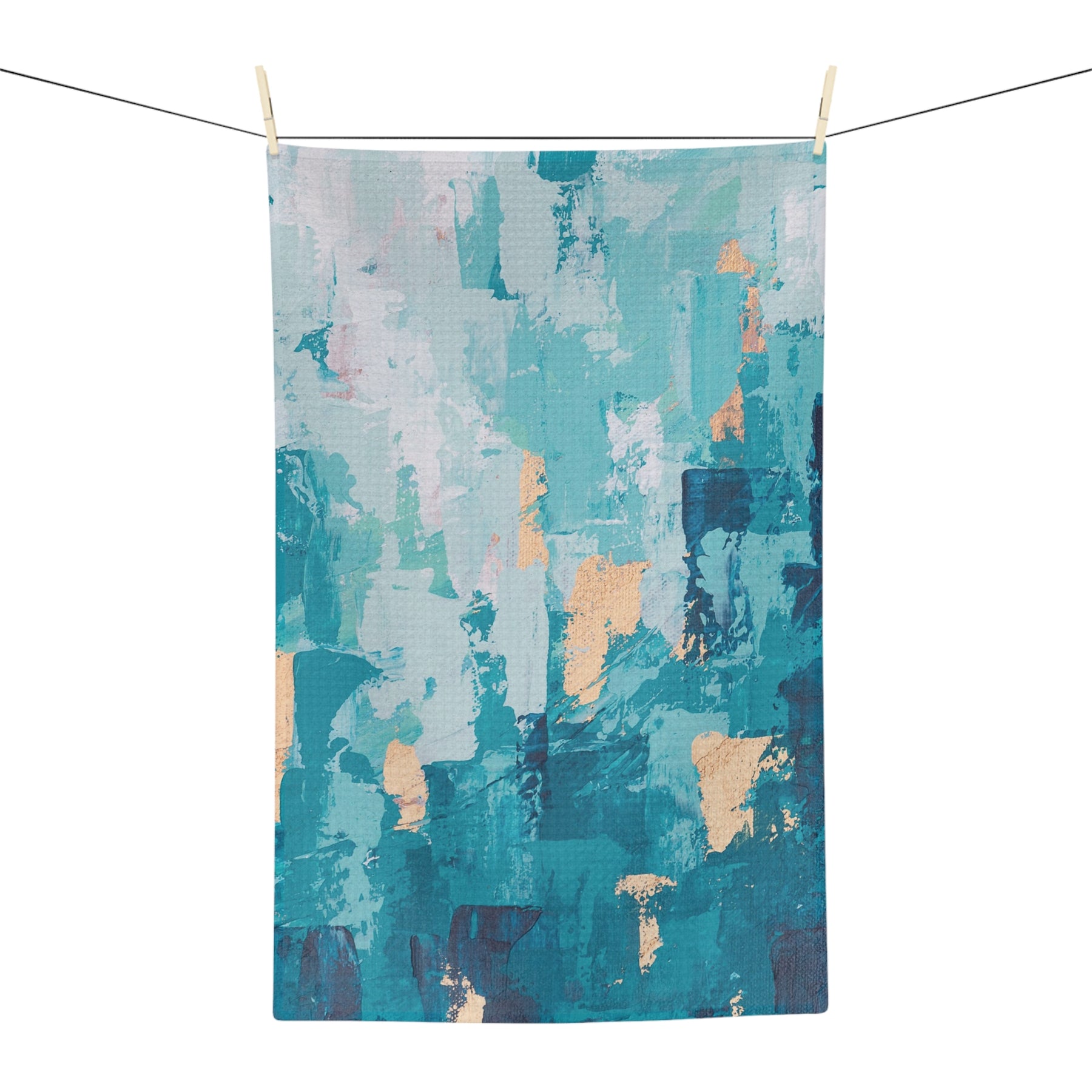 Abstract Teal & Gold Microfiber Tea Towel — Coastal Brushstroke Kitchen Towel