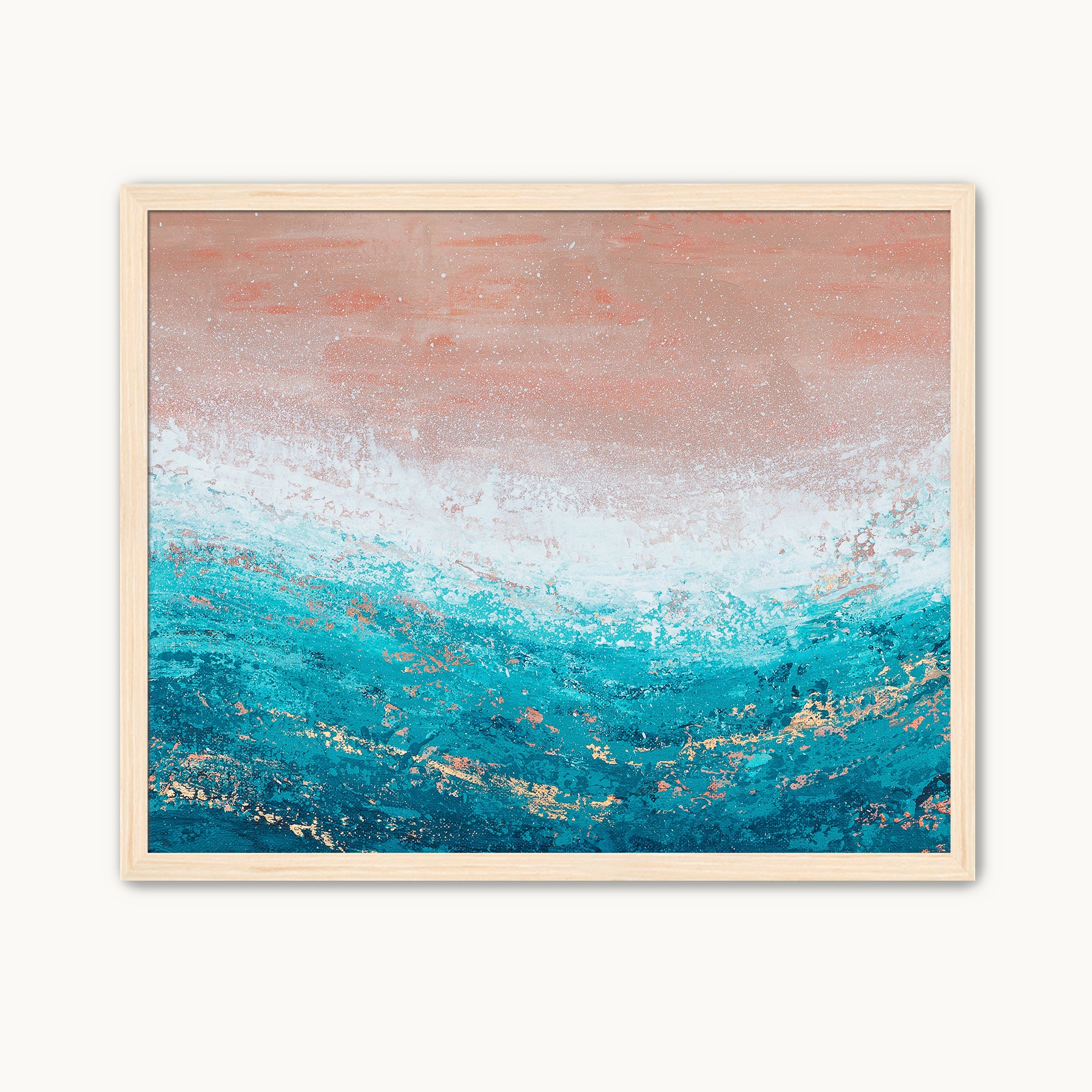 This abstract ocean wall art adds a pop of color with bright shades of teal and peachy pinks with copper peeking through. Heat Wave mimics the immediate sense of relief and relaxation that comes from something as simple as dipping your toes into the cool water on a hot day at the beach.