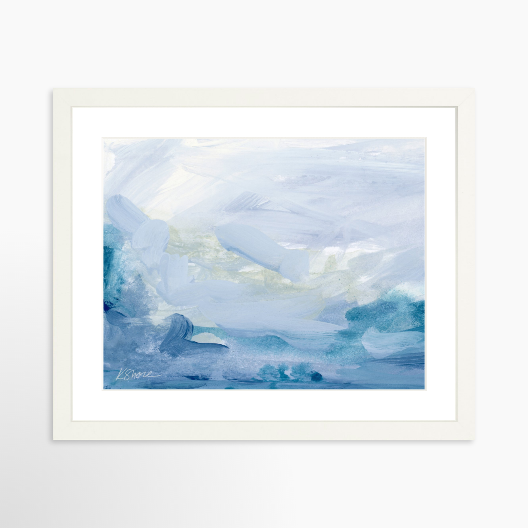 A framed abstract art print featuring flowy abstract shapes in varying shades of blue, representing a serene coastal scene.